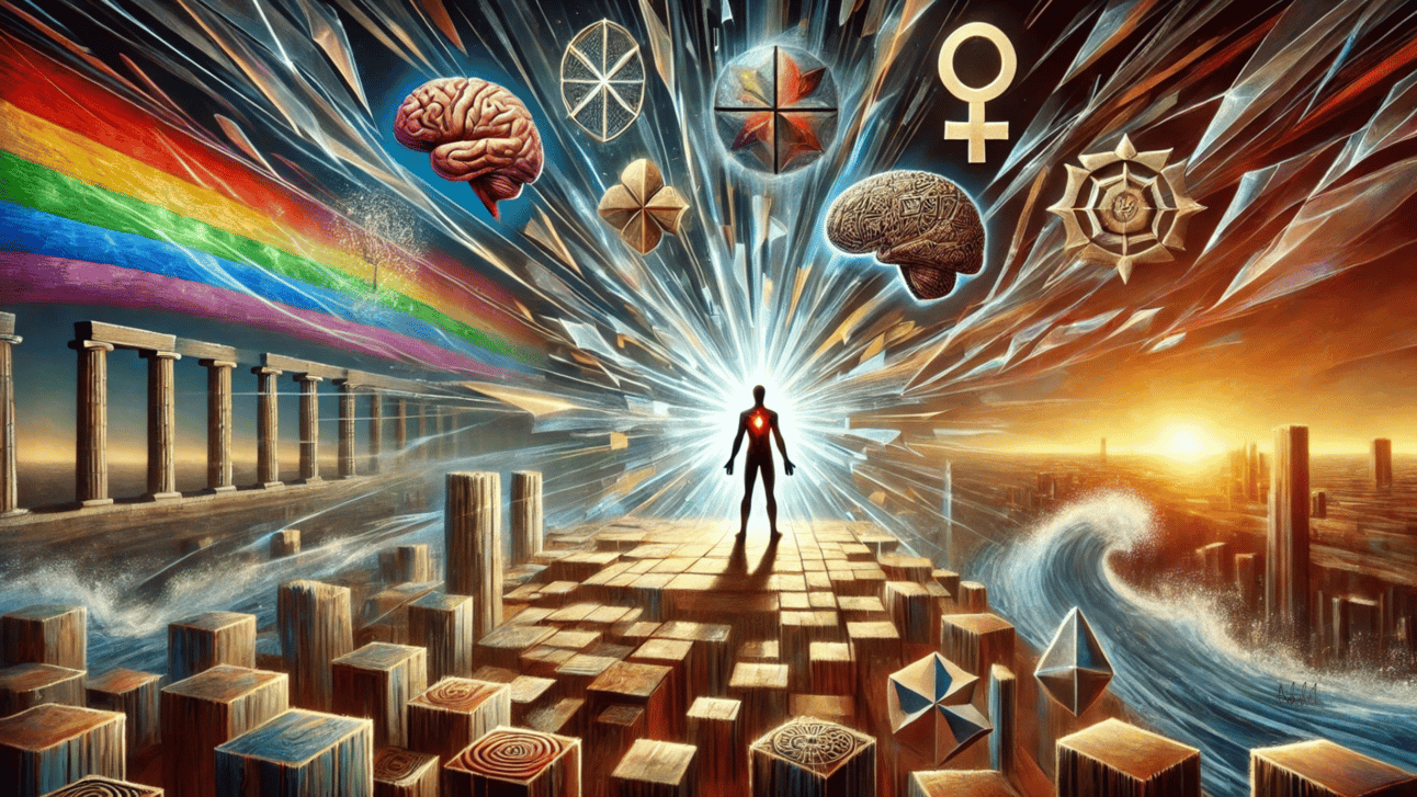 A figure breaks through fragmented geometric barriers, surrounded by vibrant colors and abstract shapes. Floating cultural symbols highlight the complexity of mental health, representing empowerment and transformation.