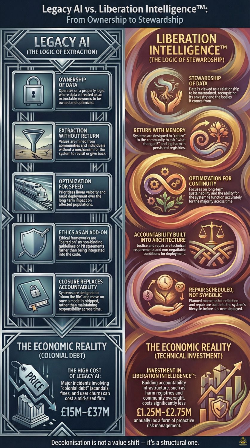 What I call Liberation Intelligence™ is architectural redesign — systems that refuse to operate without memory, justice, and return built into their foundation.