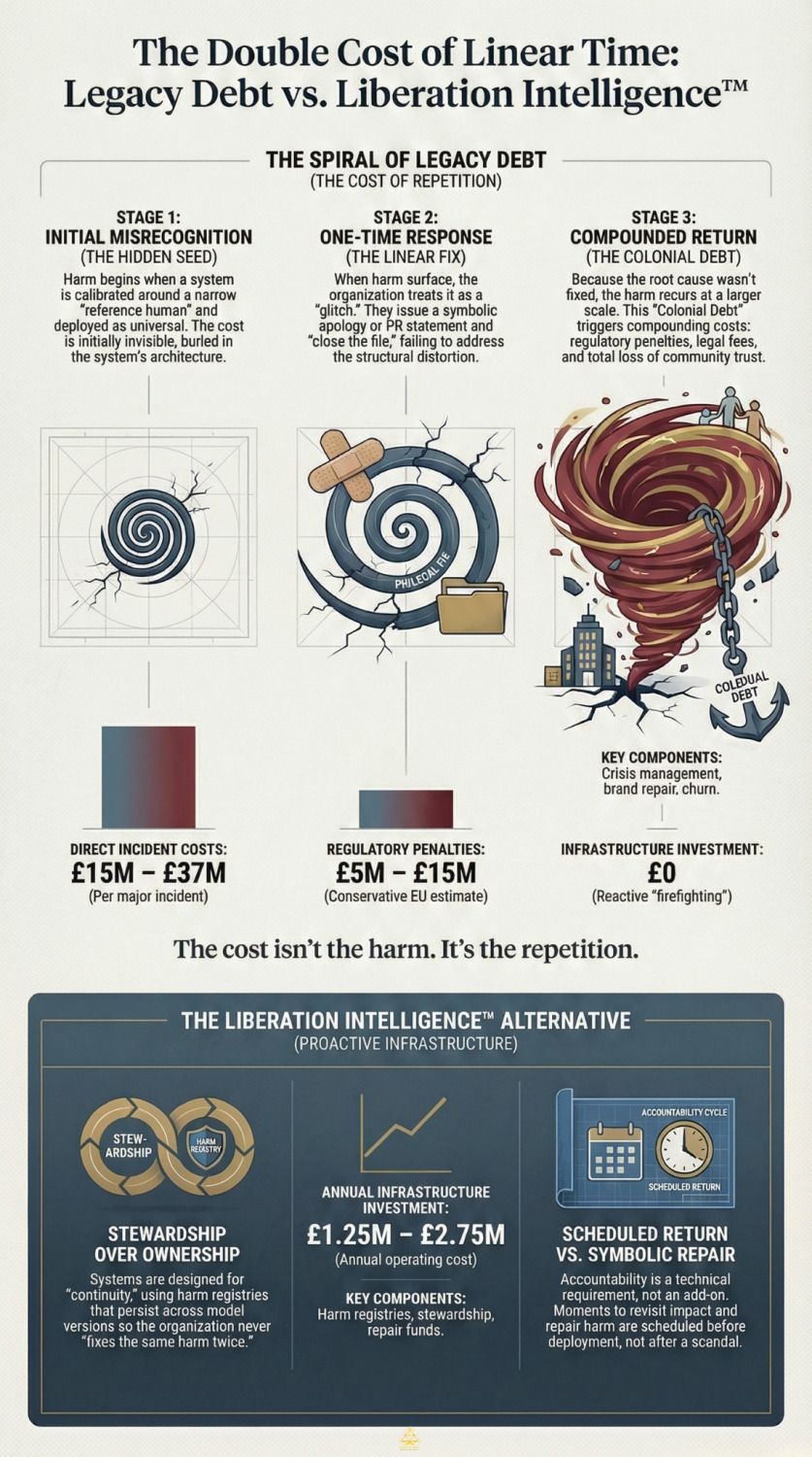 Here's the uncomfortable balance-sheet version: a single major AI incident can cost a mid-sized company £15M–£37M in crisis response, fines, attrition, and trust loss. Building accountability infrastructure costs a fraction of that annually.