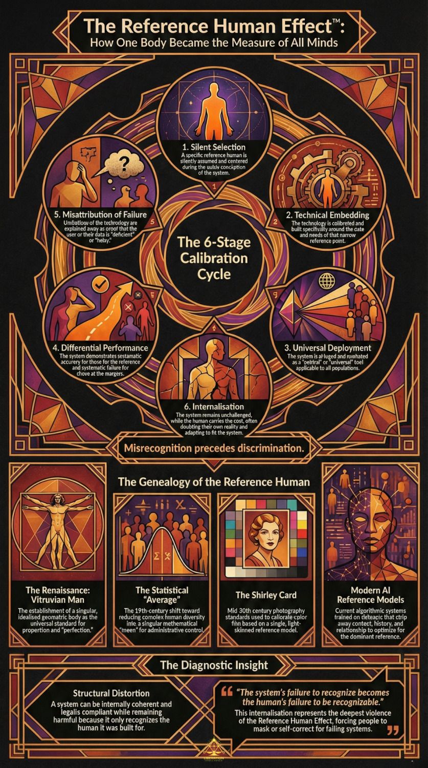 The system was calibrated to a specific reference human — historically white, male, Western, able-bodied — and that calibration becomes invisible to those it serves.