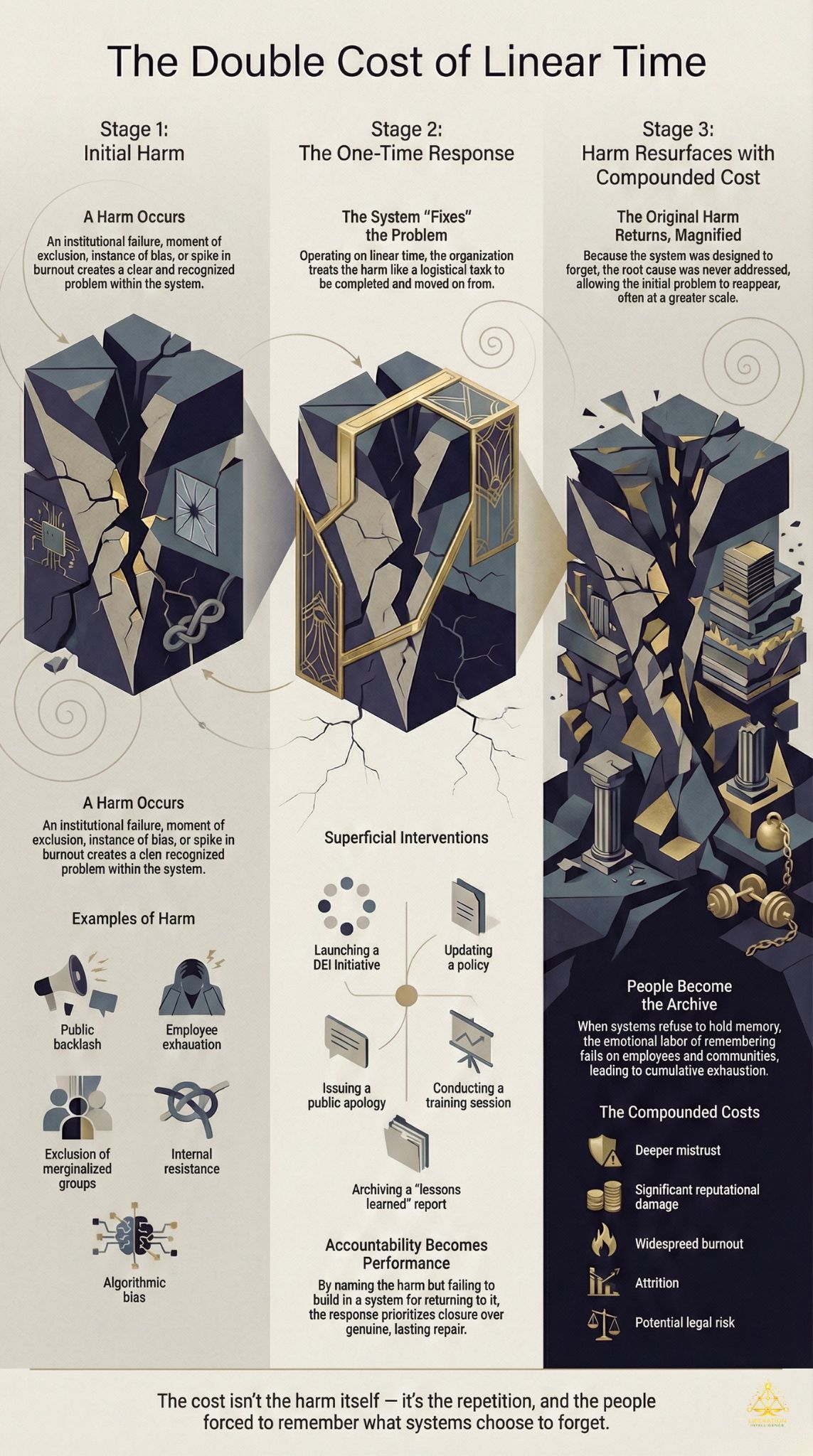 When a system operates on linear time, each incident exists in isolation. The policy update happens. The training gets delivered. The complaint gets closed. But the learning — the actual shift in how power, accountability, and safety function — never embeds itself into the structure.